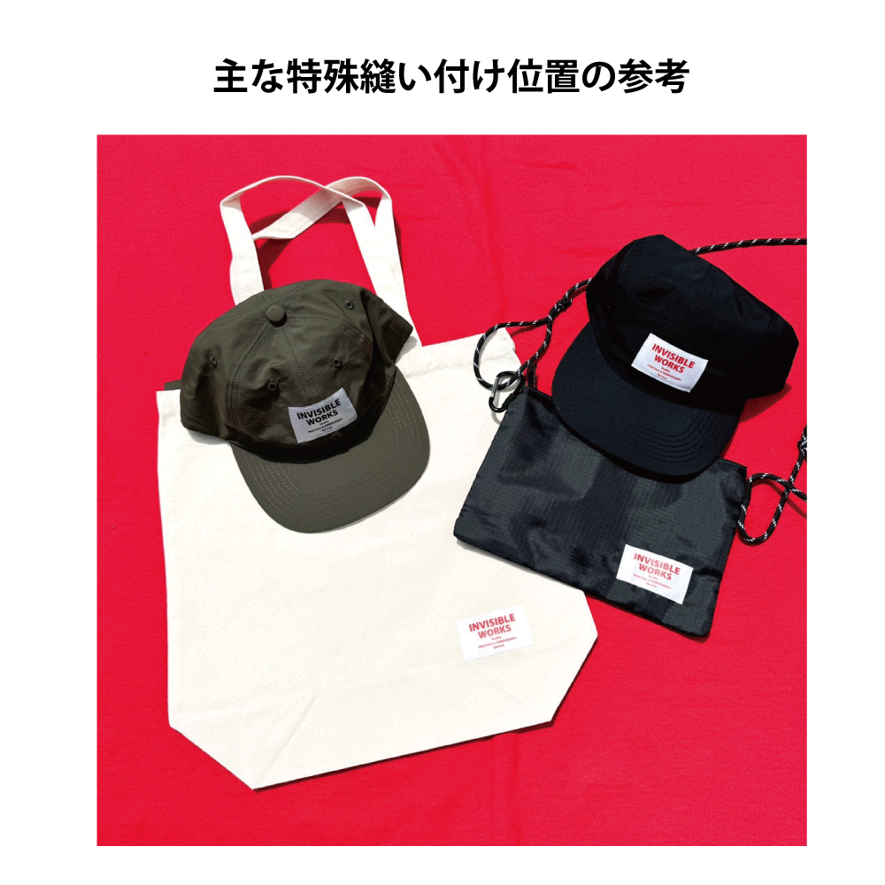 ・特殊縫い付け位置は直線縫いミシンでは縫い付けることが出来ないため、縫い付けるネームタグのサイズをデータ化し、ネームタグの端から2mm程度内側を刺繍機で縫い付けます。そのため、タグ自体の個体差によって仕上がりに多少個体差が生じる可能性がございますこと予めご了承願います。