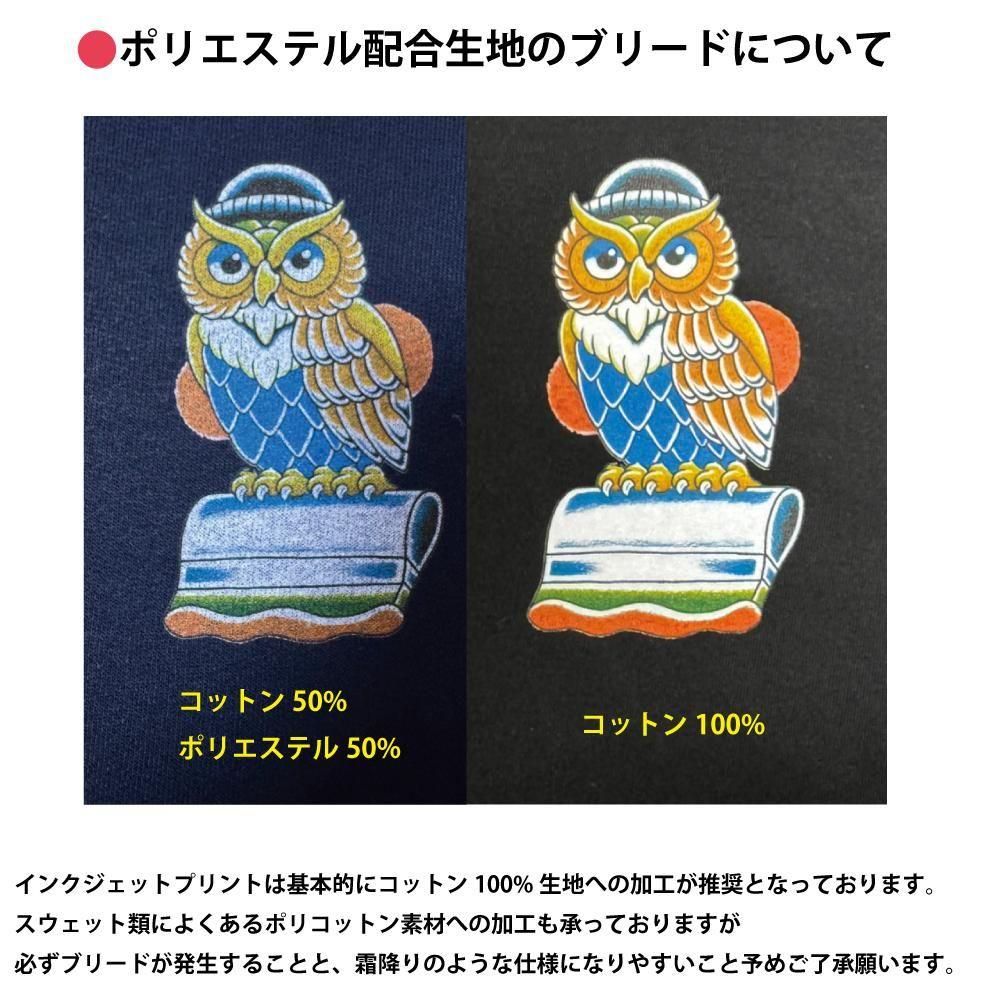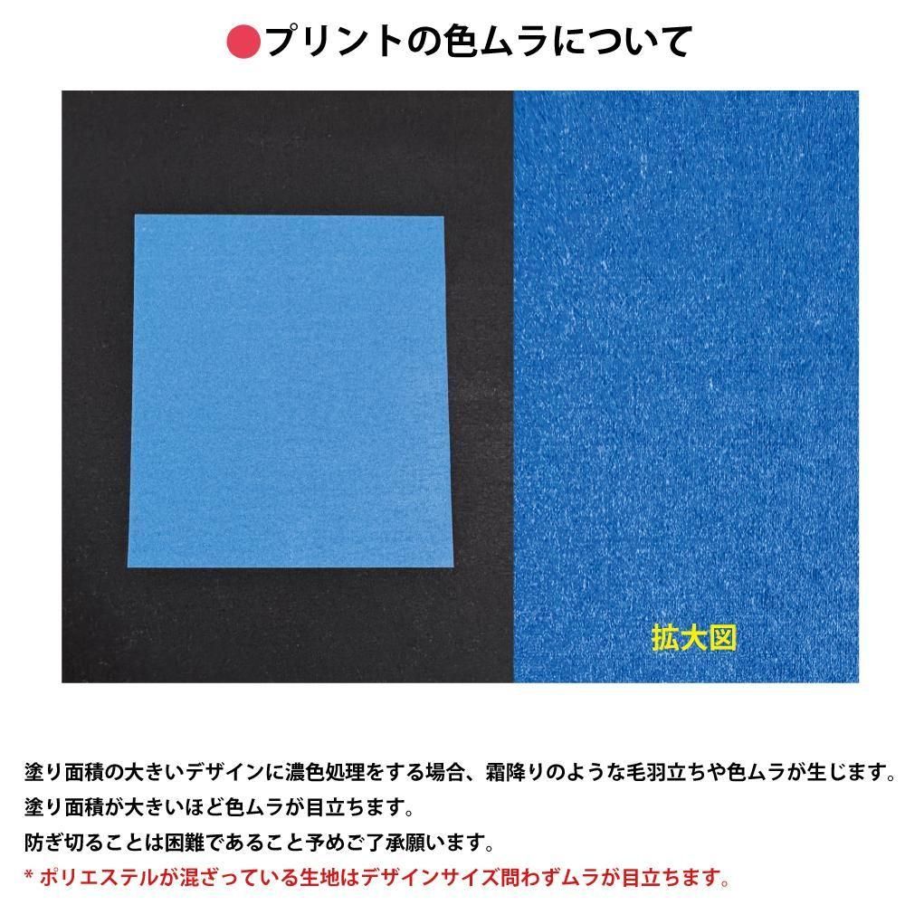 ・インク出力は最大濃度でプリントしていますが、生地やボディカラー、デザインとの相性によっては生地色が透けてしまうことがあること予めご了承ください。